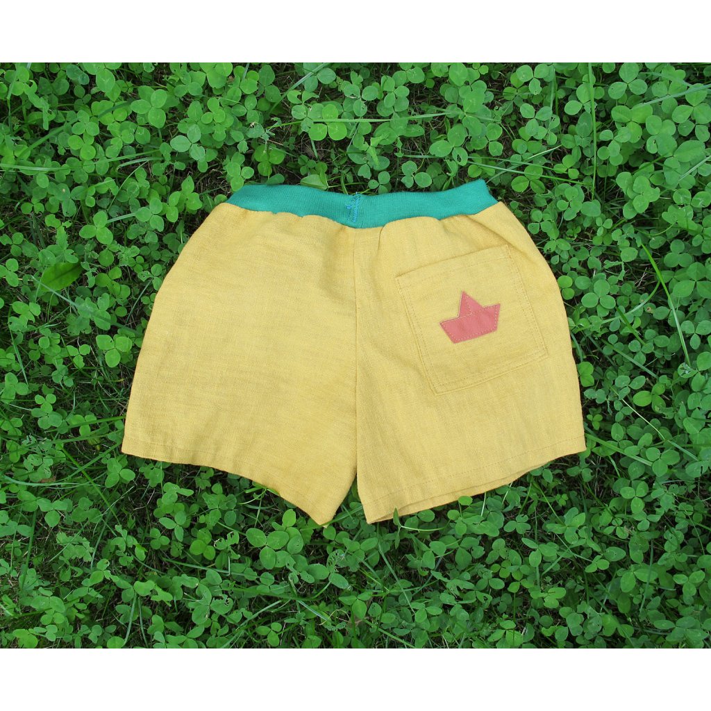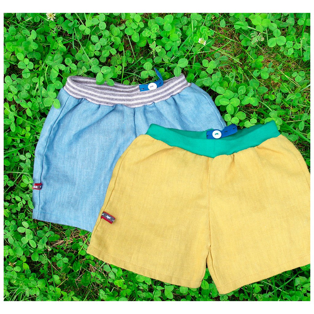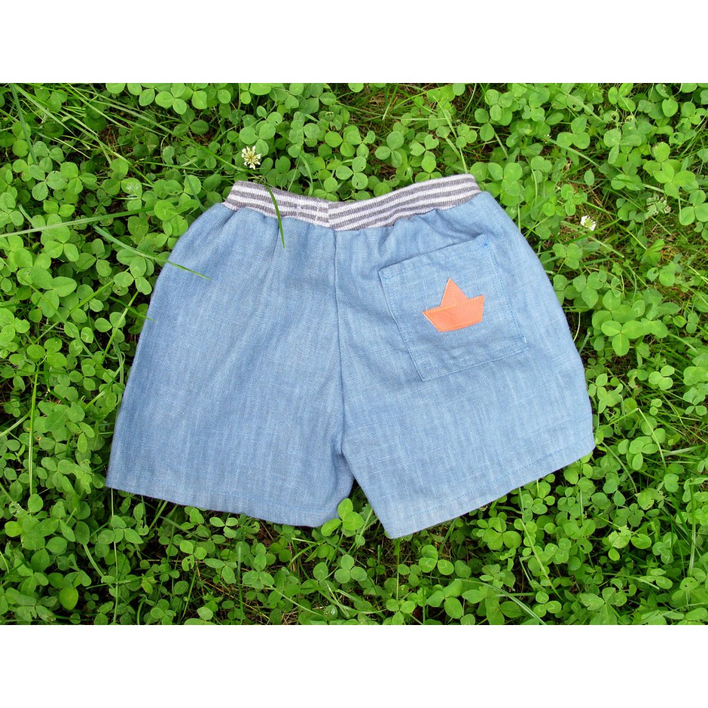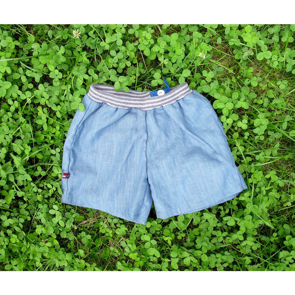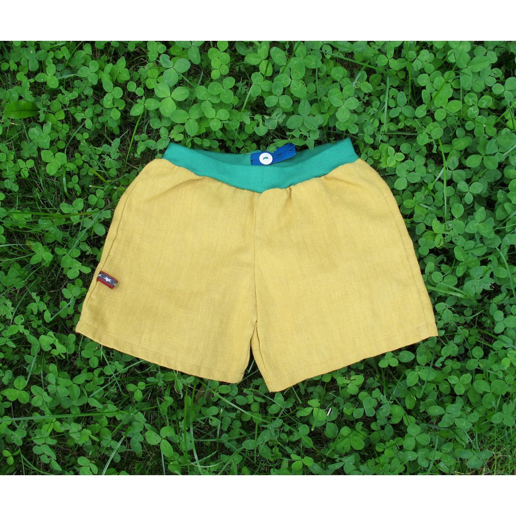 Plátěné krátké kalhoty, velikost uváděná 4-5 let, ale mohou je nosit i meší děti a vydrží déle - v pase je stahovací "knoflíková guma. V pase bavlněný náplet, vzadu kapsa.