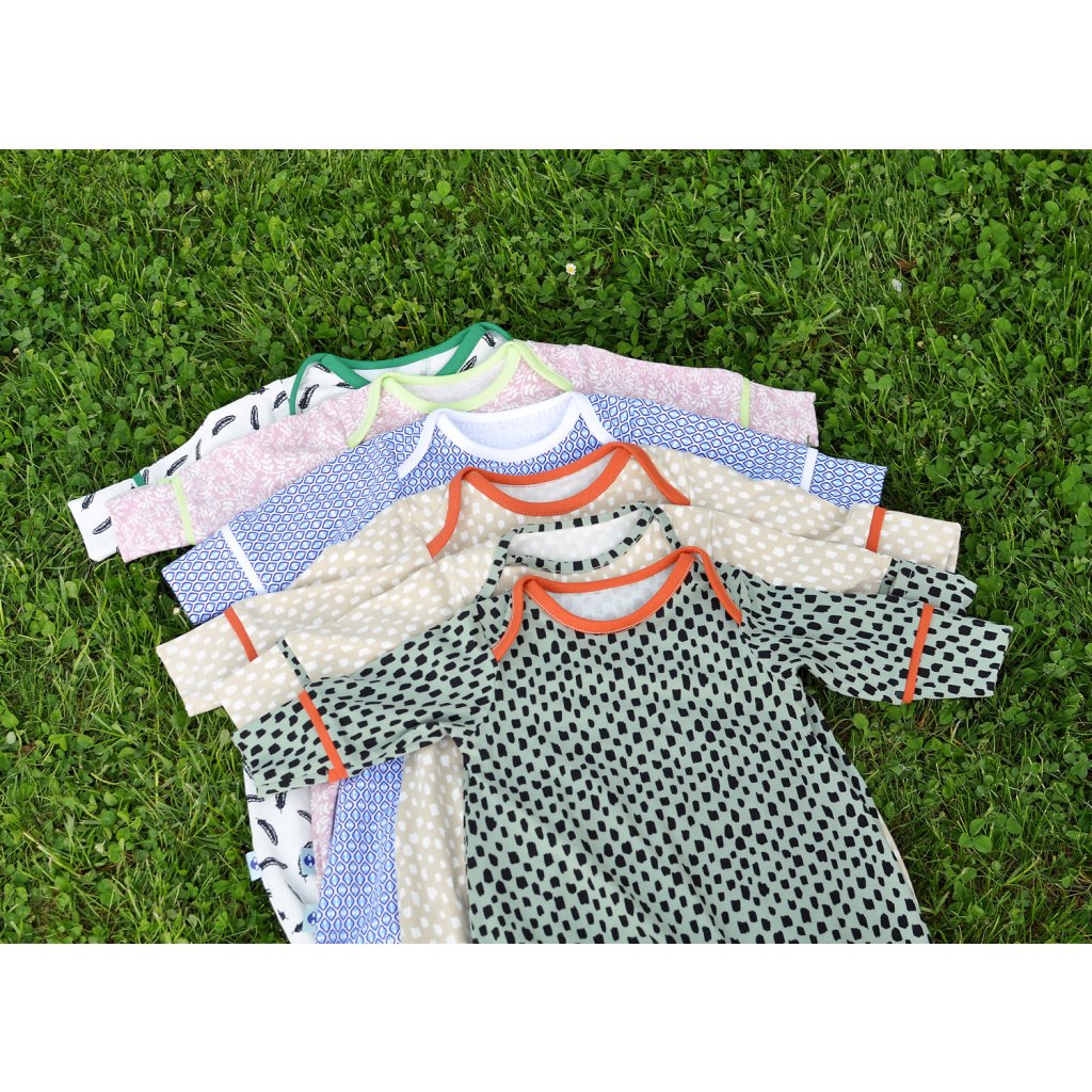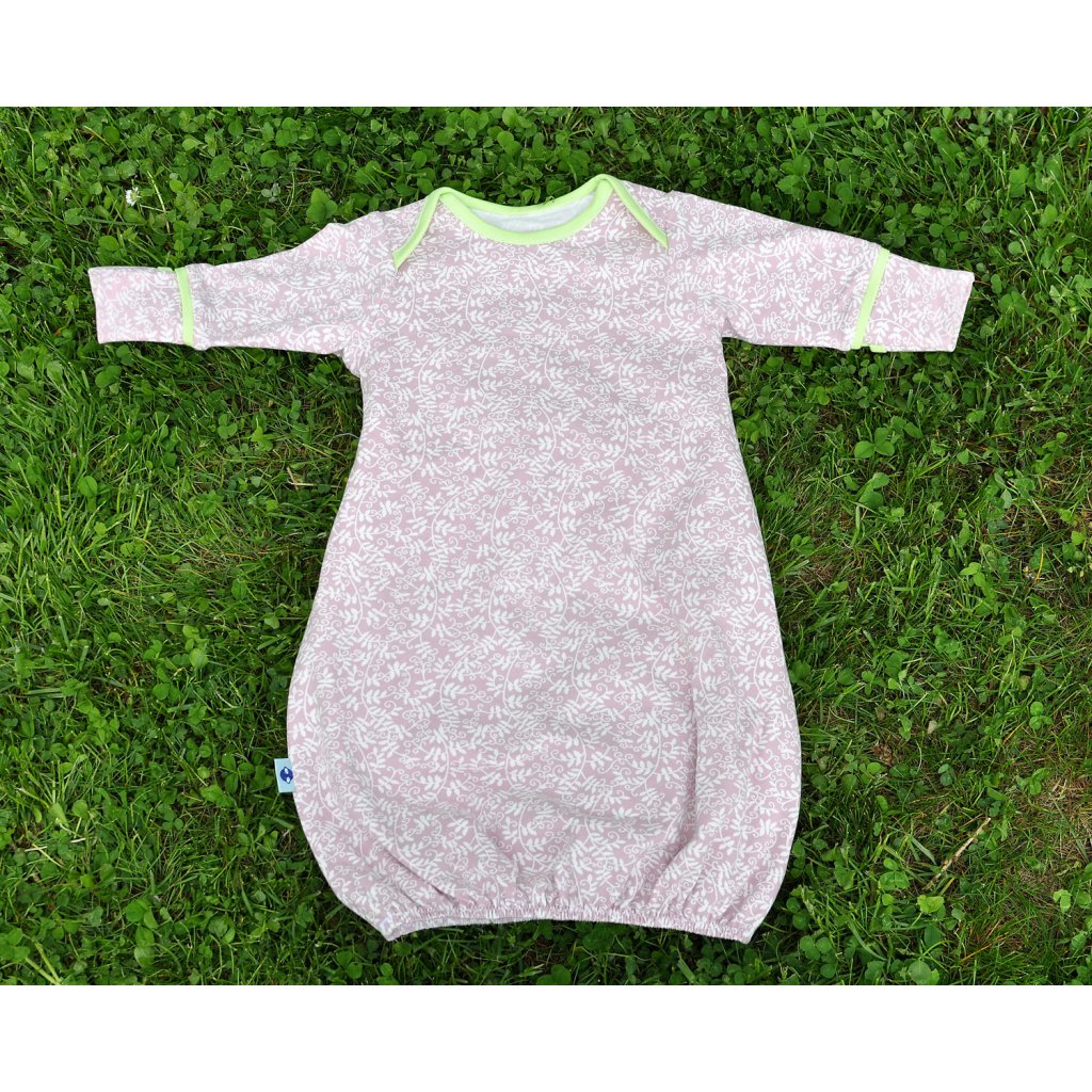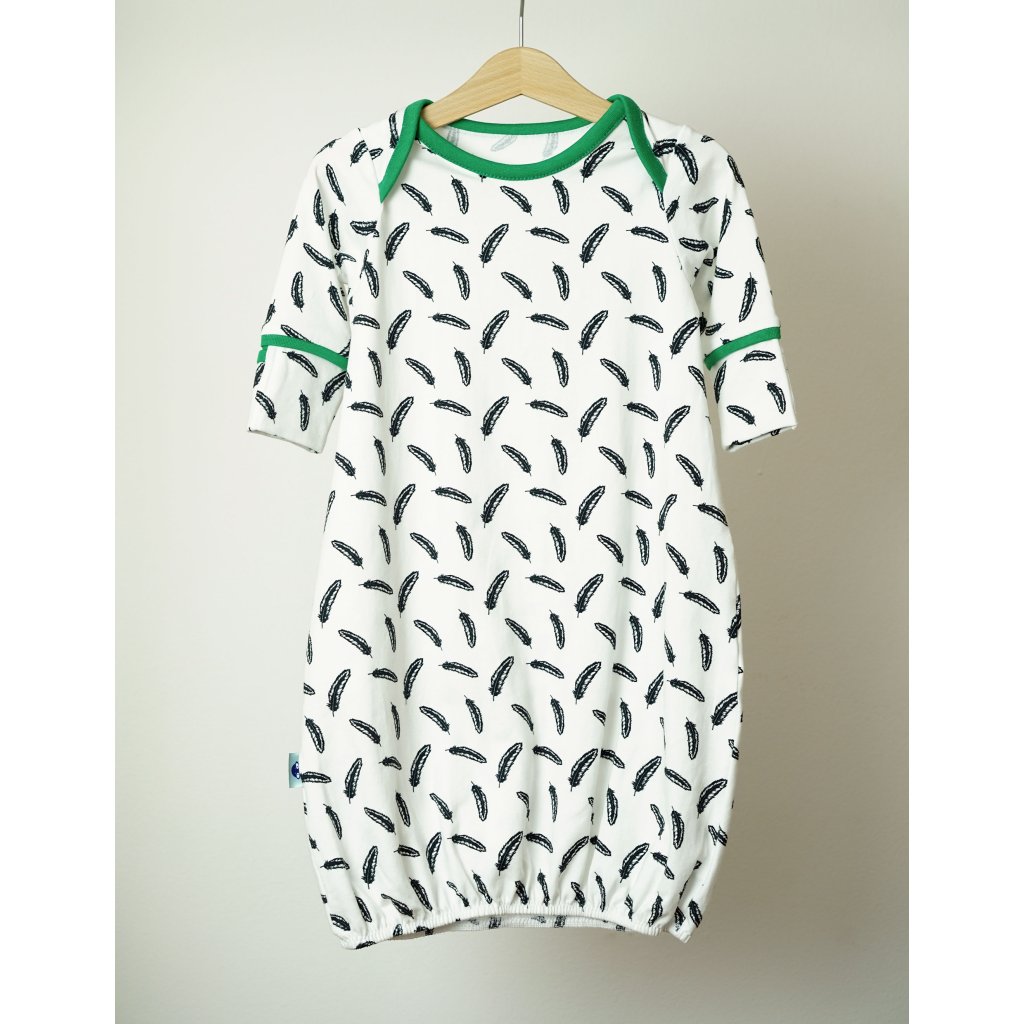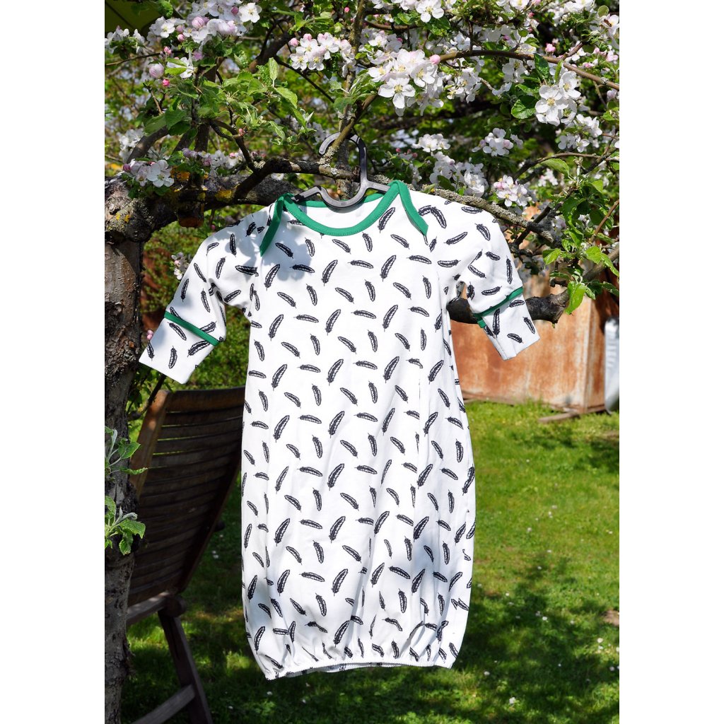 Novorozenecká noční košilka/spací pytel - při navrhování jsme se inspirovali v zahraničí, kde jsou podobné košilky běžnou součástí "šatníku" miminek. Jsou totiž velmi praktické! Zpočátku je miminko v košilce celé zabalené jako v pytli, košilka má i přehrnovací rukávky, díky kterým má miminko ruce v teple a navíc se nepoškrábe. Postupně, jak miminko roste, se ze spacího pytle stává košilka. Spodní lem košilky je stažený do gumy, aby držel pod nožičkami a zároveň umožnil jednoduché přebalování. U krku kojenecký lodičkový výstřih.