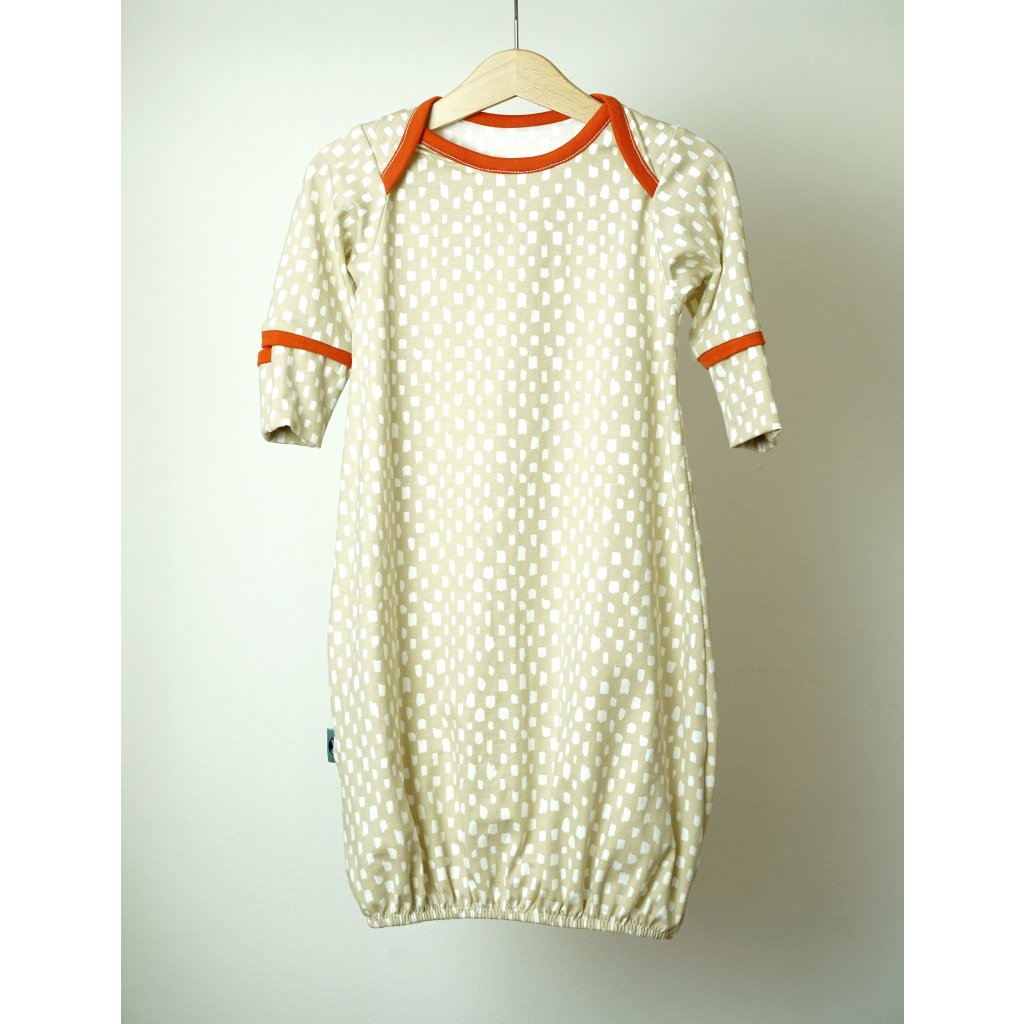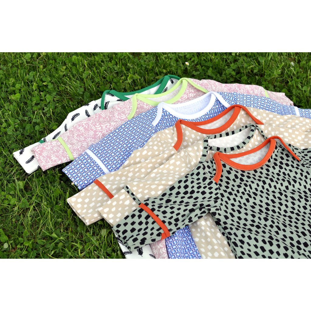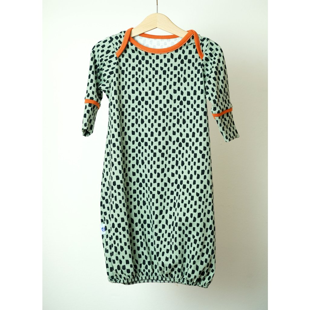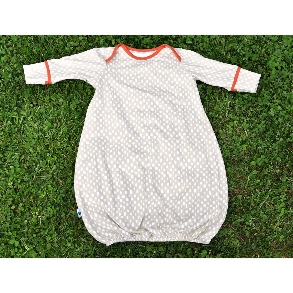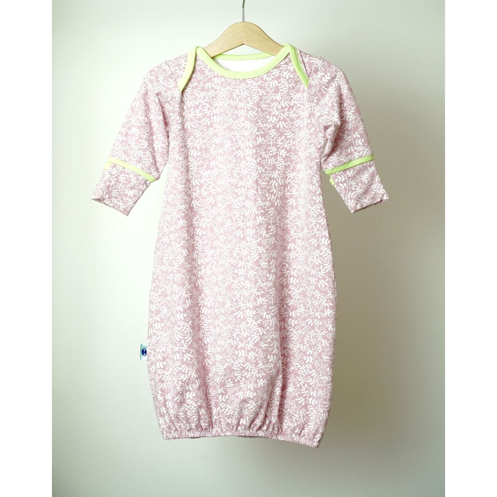 Novorozenecká noční košilka/spací pytel - při navrhování jsme se inspirovali v zahraničí, kde jsou podobné košilky běžnou součástí "šatníku" miminek. Jsou totiž velmi praktické! Zpočátku je miminko v košilce celé zabalené jako v pytli, košilka má i přehrnovací rukávky, díky kterým má miminko ruce v teple a navíc se nepoškrábe. Postupně, jak miminko roste, se ze spacího pytle stává košilka. Spodní lem košilky je stažený do gumy, aby držel pod nožičkami a zároveň umožnil jednoduché přebalování. U krku kojenecký lodičkový výstřih.