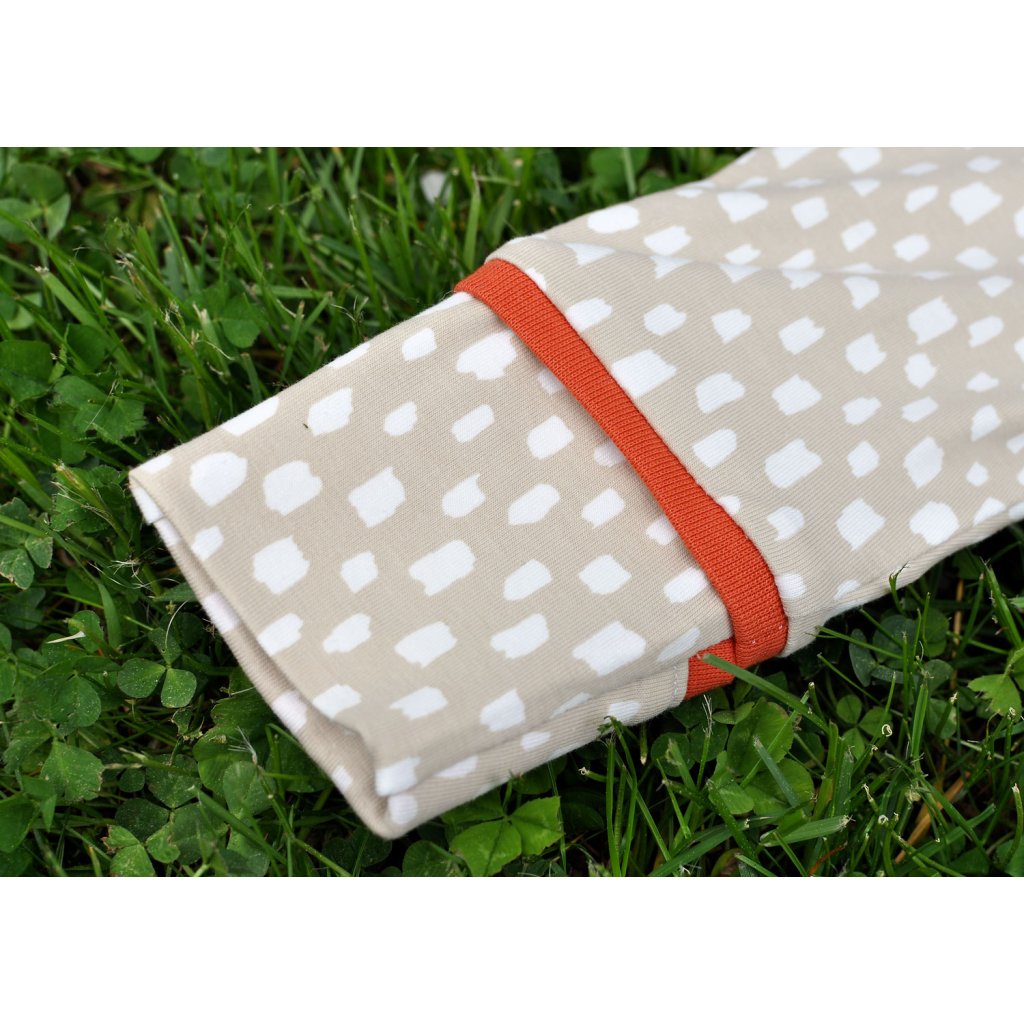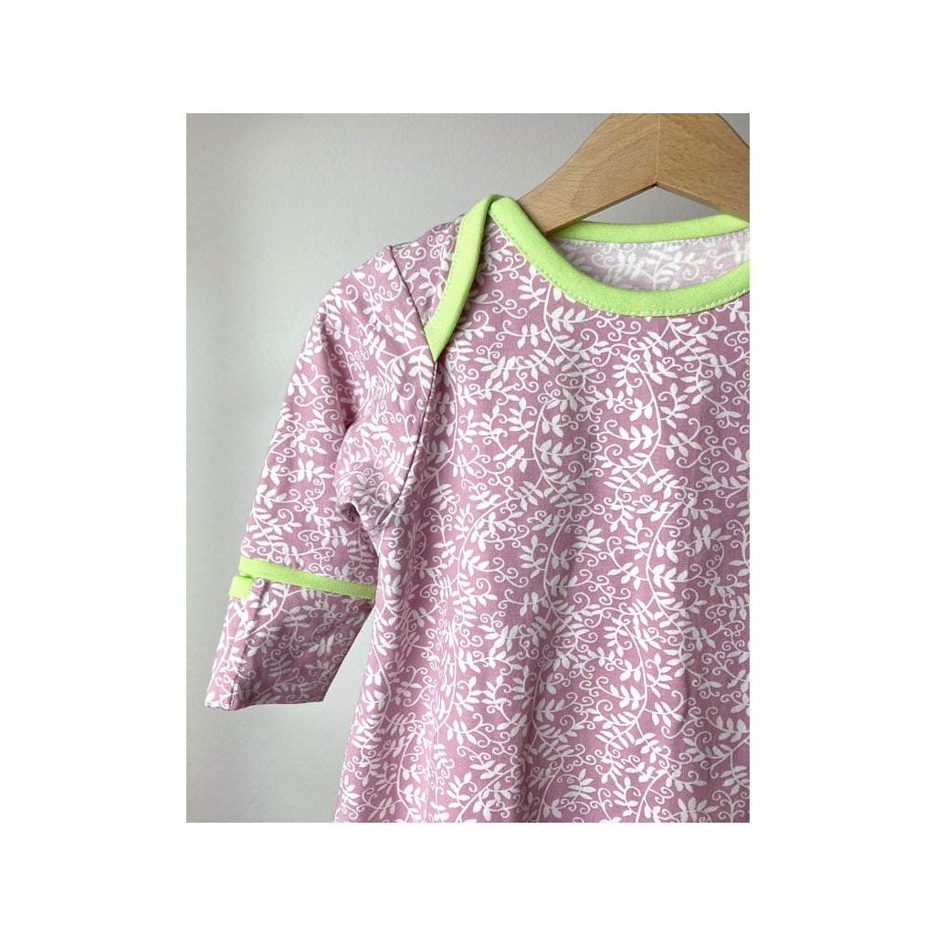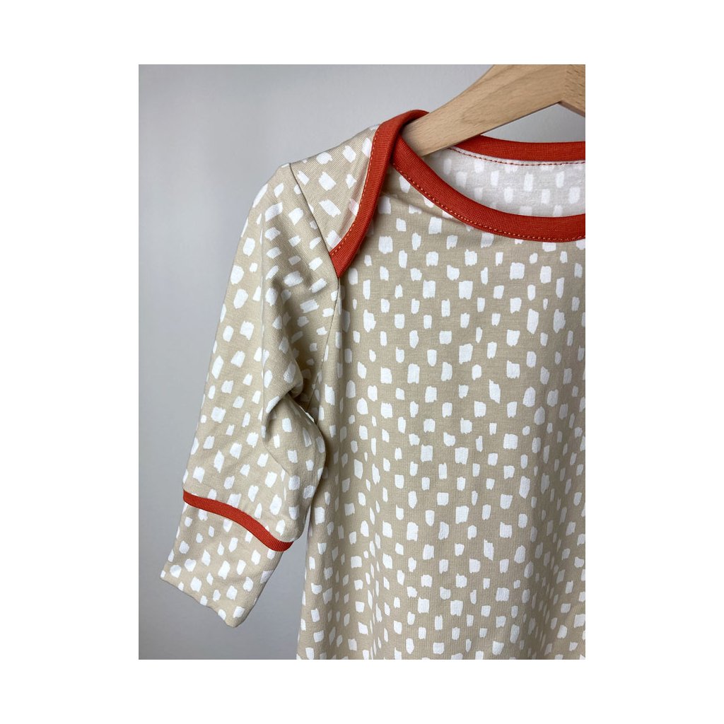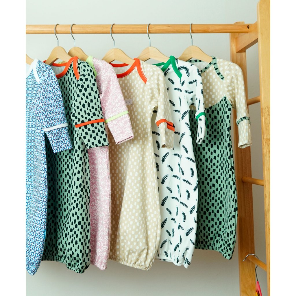 Novorozenecká noční košilka/spací pytel - při navrhování jsme se inspirovali v zahraničí, kde jsou podobné košilky běžnou součástí "šatníku" miminek. Jsou totiž velmi praktické! Zpočátku je miminko v košilce celé zabalené jako v pytli, košilka má i přehrnovací rukávky, díky kterým má miminko ruce v teple a navíc se nepoškrábe. Postupně, jak miminko roste, se ze spacího pytle stává košilka. Spodní lem košilky je stažený do gumy, aby držel pod nožičkami a zároveň umožnil jednoduché přebalování. U krku kojenecký lodičkový výstřih.