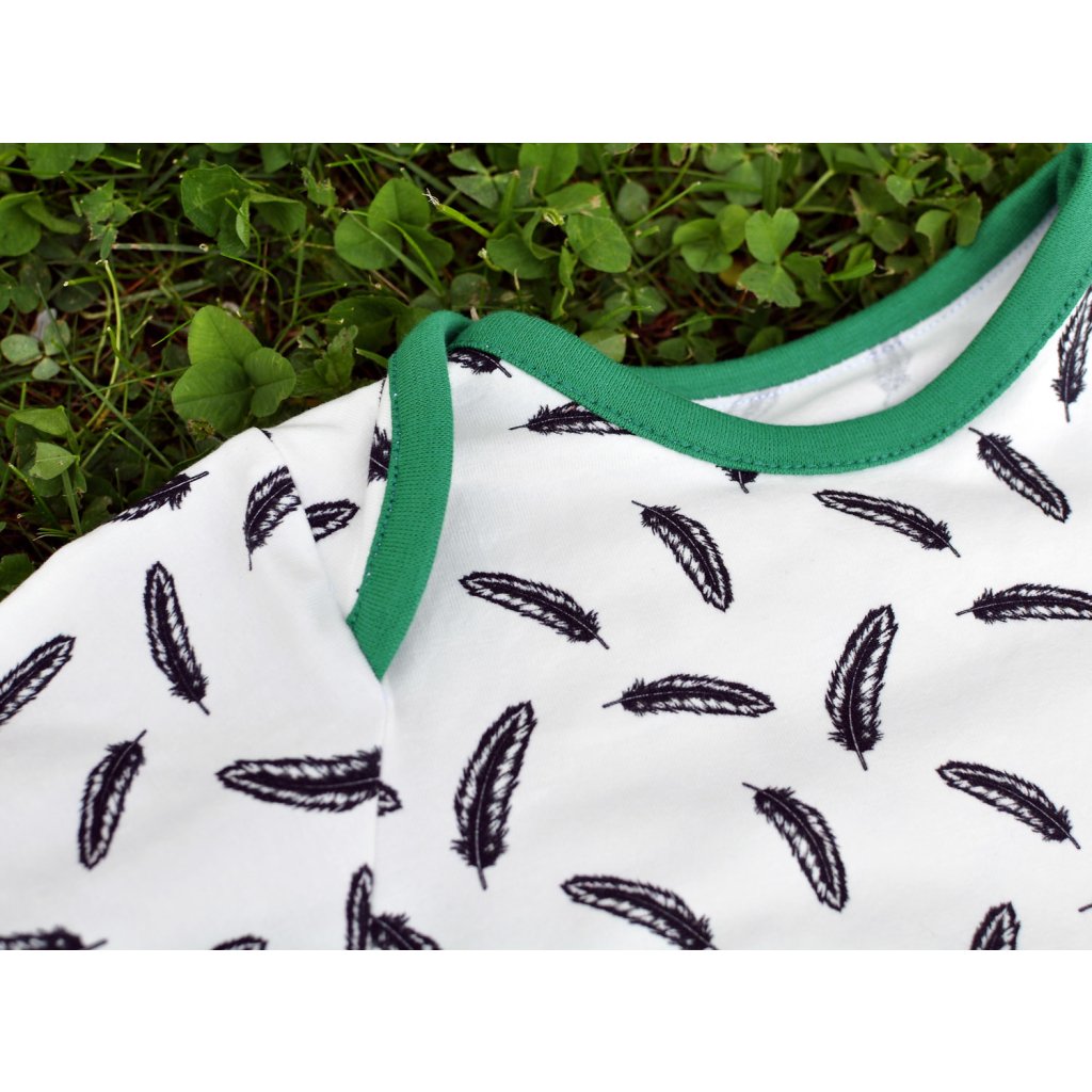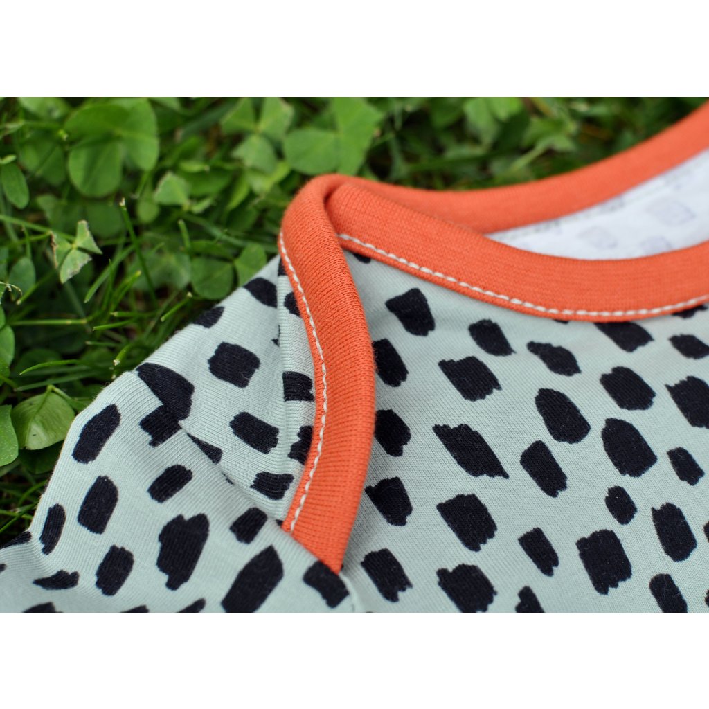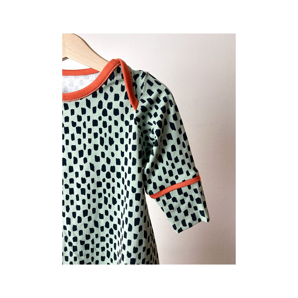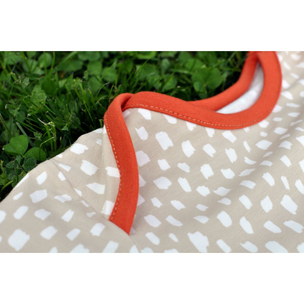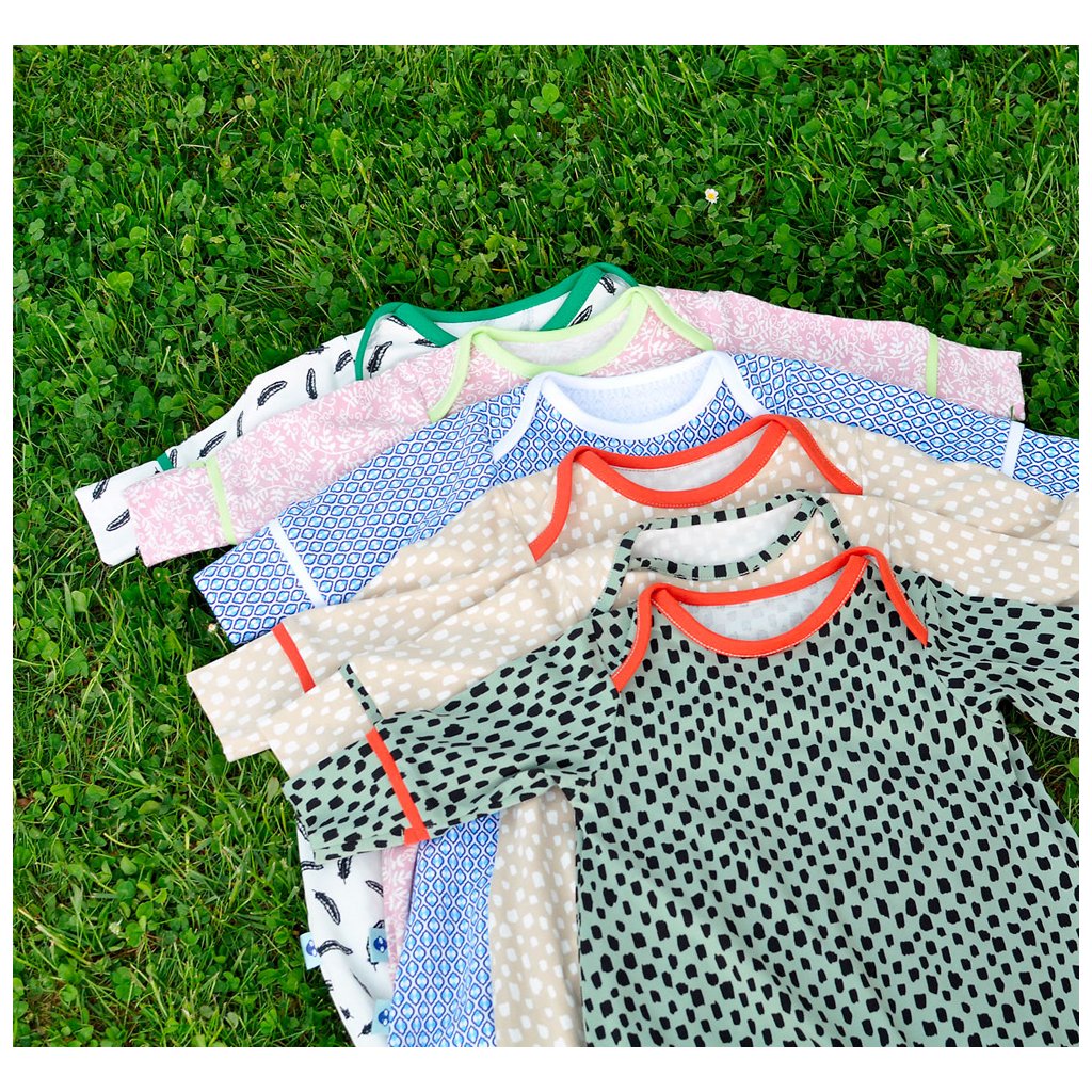 Novorozenecká noční košilka/spací pytel - při navrhování jsme se inspirovali v zahraničí, kde jsou podobné košilky běžnou součástí "šatníku" miminek. Jsou totiž velmi praktické! Zpočátku je miminko v košilce celé zabalené jako v pytli, košilka má i přehrnovací rukávky, díky kterým má miminko ruce v teple a navíc se nepoškrábe. Postupně, jak miminko roste, se ze spacího pytle stává košilka. Spodní lem košilky je stažený do gumy, aby držel pod nožičkami a zároveň umožnil jednoduché přebalování. U krku kojenecký lodičkový výstřih.